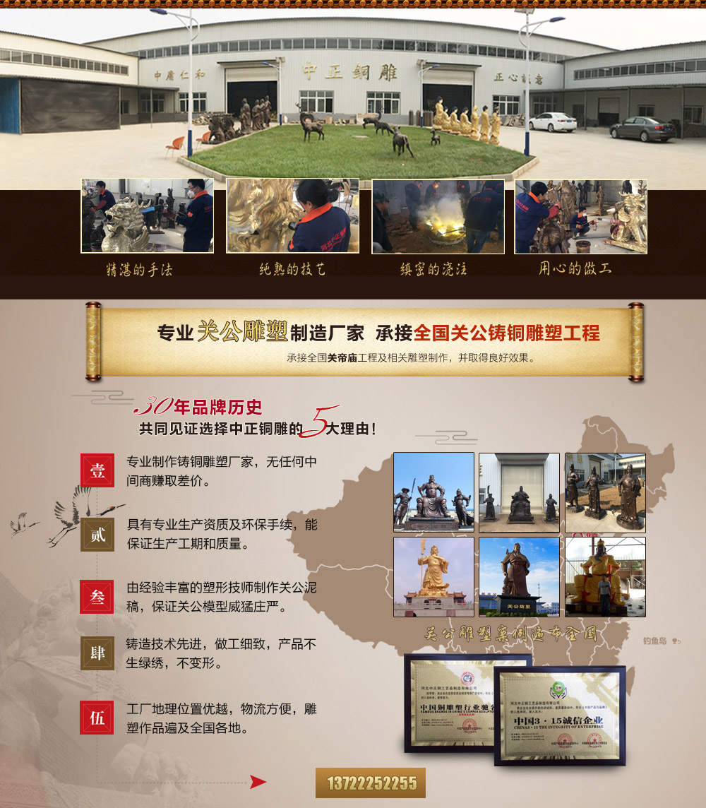 河北中正銅工藝品制造有限公司是一家具有獨立設(shè)計、雕塑、鑄造、制作施工能力的單位。擁有完善的,大型的,先進的生產(chǎn)設(shè)備,并由多位經(jīng)驗豐富的高級鑄造技師指導(dǎo)生產(chǎn)及制作。公司主要鑄造銅關(guān)公,九龍銅關(guān)公,福建銅關(guān)公,臺灣銅關(guān)公,關(guān)羽雕塑,鑄銅關(guān)公,銅雕關(guān)公,1米銅關(guān)公,2米銅關(guān)公等,可按客戶提供動物銅雕圖片訂做加工銅關(guān)公,九龍銅關(guān)公,做工精美,質(zhì)量保證。